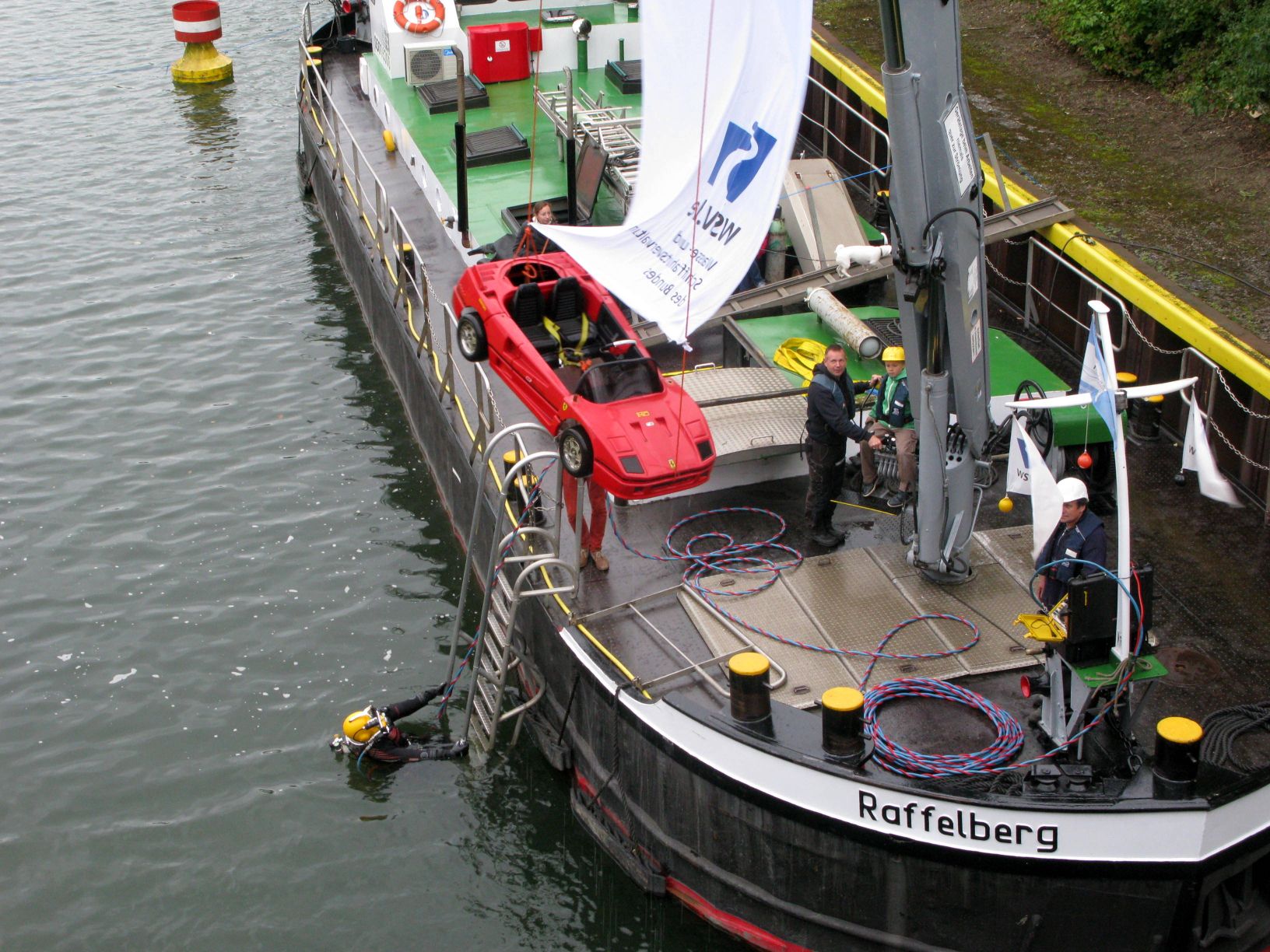 Also bin ich noch ein paar Meter weiter an die Schleuse nach Gelsenkirchen. Wenige Meter neben der Stelle, wo im letzten Jahr die Kanalbesichtigung des neuen Emscherkanals stattfand, war am Samstag Tag der offenen Türe an der Schleuse. Die Feuerwehr zeigte auch hier ihr Können, ein Binnenschiff konnte besichtigt werden und eine Schleusenkammer war trockengelegt, so daß man ihr bis auf den Grund schauen konnte. Vor der Schleuse zeigte ein Taucher sein Können, bei der Bergung eines Ferraris 🙂 aus dem Rhein-Herne-Kanal. Mittlerweile hatte der Regen wieder aufgehört, aber der Wind der übers Wasser blies, fühlte sich irgendwie herbstlich an. Ich denke der Kanal hätte mehr verdient gehabt, aber an diesem Wochenende sah das Wetter irgendwie nicht nach Geburtstag aus.