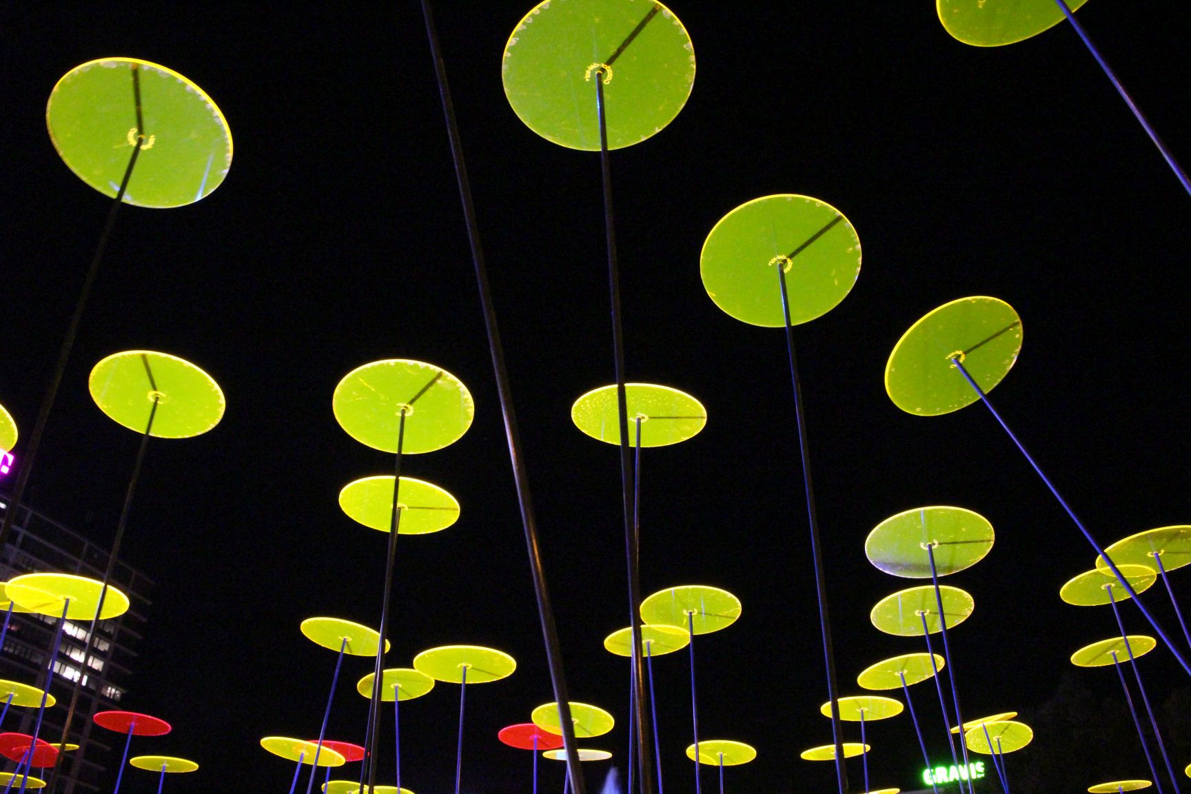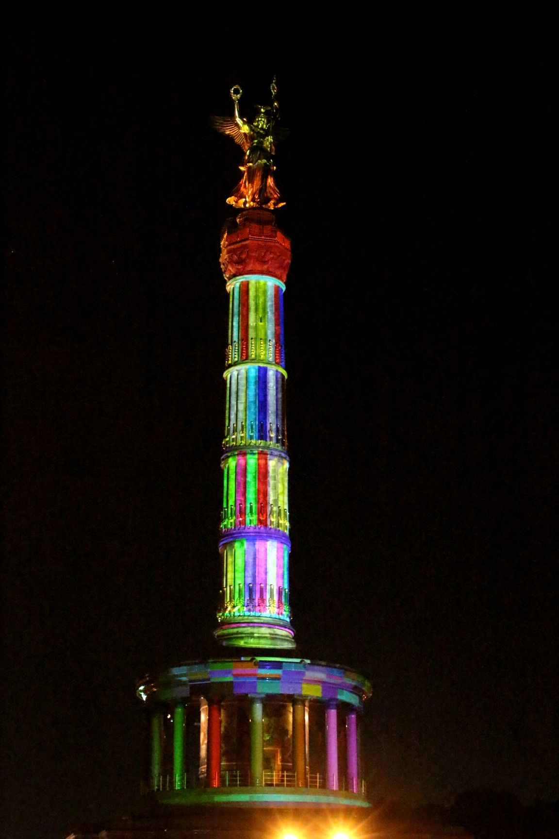 Der zweite Abend startet am Ernst-Reuter-Platz und rund um das Neue Kranzler Eck. Vielleicht habe ich die entscheidenden Stellen verpaßt, aber rund ums Neue Kranzler Eck war es doch etwas enttäuschend, denn wenn ein Hotel in der 10. Etage ein paar bunte Lampen in Gang setzt ist das fototechnisch doch eher suboptimal. Dann lieber zur Siegessäule. Leider ist die Anfahrt via ÖPNV etwas ungünstig und mit ca. 1 km Fußmarsch von der S-Bahnstation Tiergarten verbunden. Egal, auf geht’s.