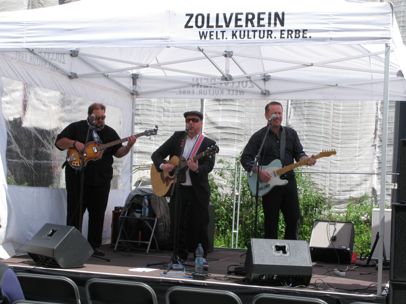 Zurück auf dem Platz vorm RuhrMuseum, der Andrang vor der Bühne war nach wie vor überschaubar, aber das Hubert Dingenskirchen Trio (Zitat: „Hubert Dingenskirchen der Erfinder des EmscherDeltaBlues & des abwaschbaren GrossStadtfolks“) war angekündigt. Der heißt wirklich Dingenskirchen, auch wenn Dingenskirchen im Ruhrpott eher sowas wie ein Platzhalter für alles Mögliche ist. Der heißt natürlich nicht im wahren Leben Dingenskirchen aber das wird jetzt zu kompliziert und ich kann heute nicht kompliziert. Während ich dort also der Musik lausche und mit einem Bein im Takt wippe kommen weitere „Facebook Freunde“ vorbei. Schon lustig, daß man sich bei der Gelegenheit trifft.